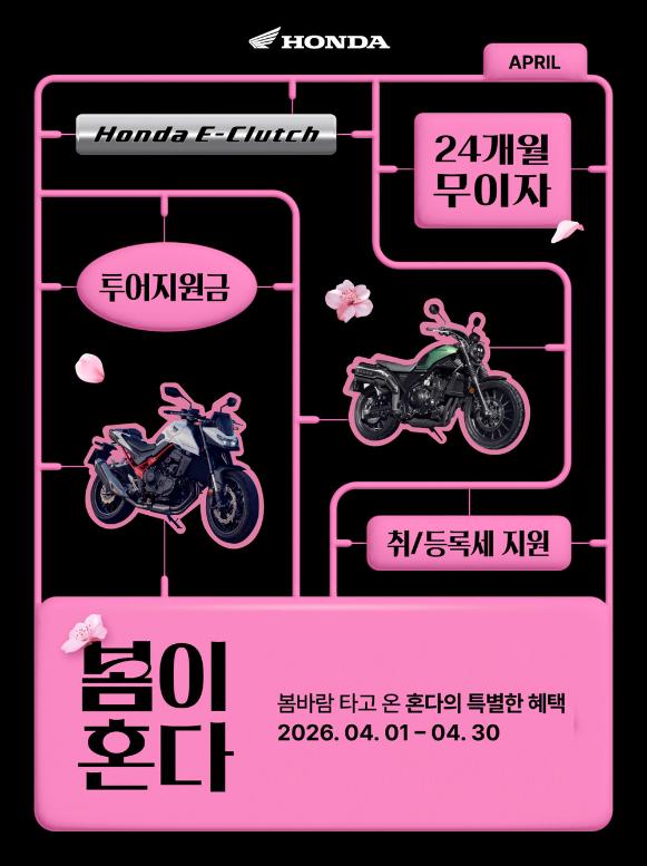 혼다코리아가 본격적인 라이딩 시즌인 4월을 맞아 전 모델을 아우르는 대규모 모터사이클 구매 프로모션을 실시한다고 발표했다. 이번 프로모션은 125cc 이하 실속형 모델을 위한 '스...
