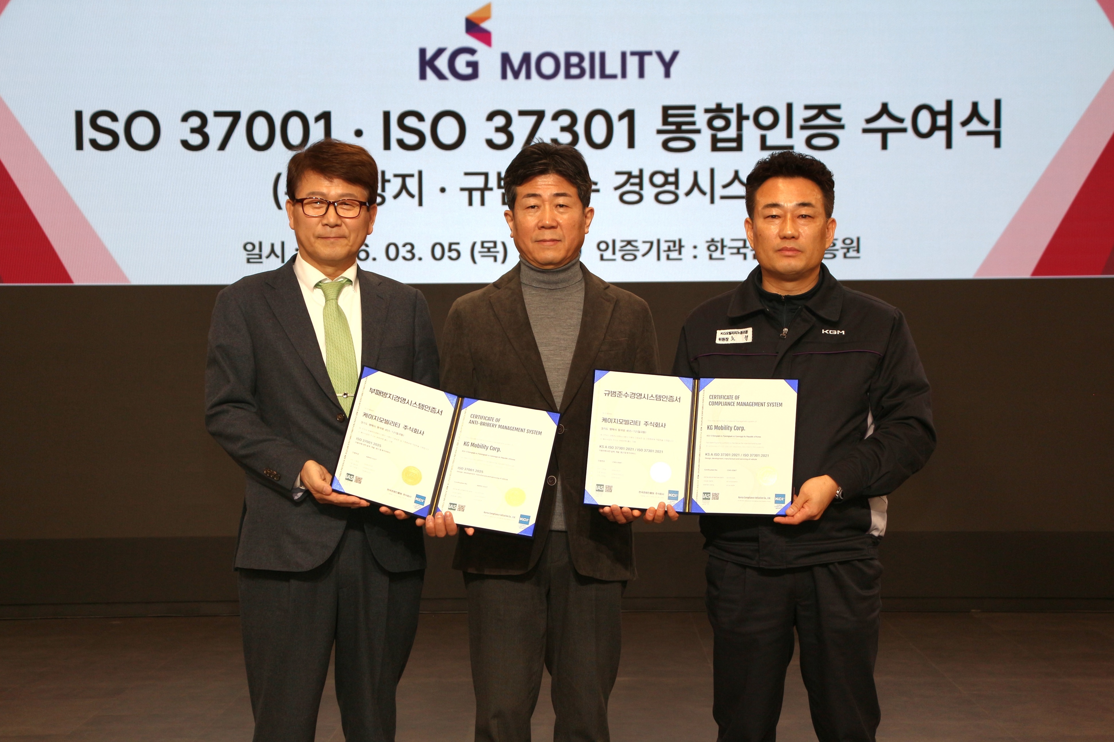 KG 모빌리티(KGM)가 부패방지경영시스템(ISO 37001)과 규범준수경영시스템(ISO 37301) 인증을 동시에 획득하고 컴플라이언스(Compliance) 경영 시스템 도입을 ...