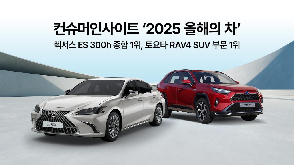 한국토요타자동차는 30일 자동차 리서치 전문기관 컨슈머인사이트가 실시한 ‘2025 연례 자동차 기획조사’에서 렉서스 ES 300h가 ‘올해의 차’ 종합 1위, 토요타 RAV4가 SUV 부문 1위를 차지했다고 밝혔다.