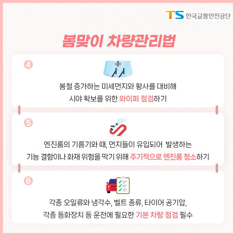 TS는 기본 자가 점검 방법 학습과 필요 시 정비소를 방문할 것을 제안했다. 정용식 TS 이사장은 “봄 행락철 가족 모두가 안전한 여행이 될 수 있도록 운행 전 자동차 점검은 필수”라고 말했다. 그는 “교통사고 걱정 없는 안전한 일상을 위해 과속운전 무조건 금지, 안전벨트 무조건 착용 등 안전수칙 준수에 동참해 주시길 바란다”고 밝혔다.